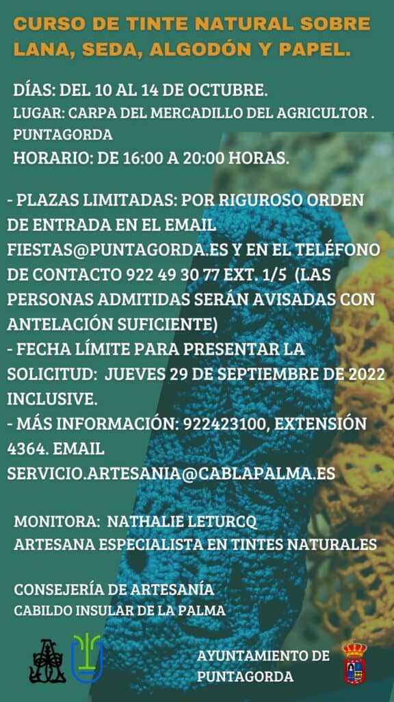 Del 10 al 14 de octubre tendrá lugar en la carpa del Mercadillo del Agricultor de Puntagorda, en horario de 16 a 20 horas el curso de tinte natural sobre lana, seda, algodón y papel, impartido por Nathalie Leturq, artesana especialista en tintes naturales.