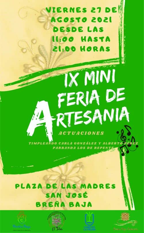 La Asociación de Artesanos «El Telar» de Breña Baja y la Concejalía de Artesanía del Ayuntamiento de Breña Baja organizan la IX Mini Feria de Artesanía el viernes 27 de Agosto de 11 a 21 hs en la Plaza de Las Madres de San José. Con la colaboración de la Consejería de Artesanía del Cabildo Insular de La Palma.